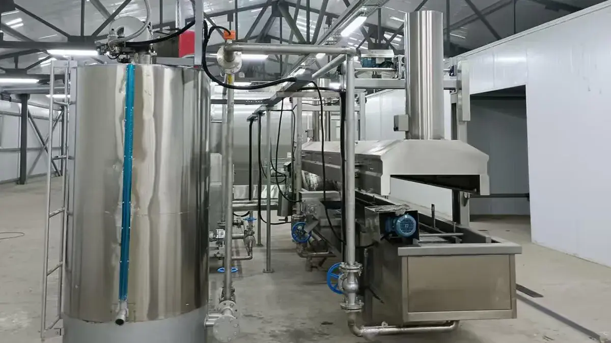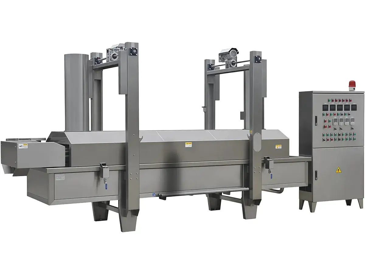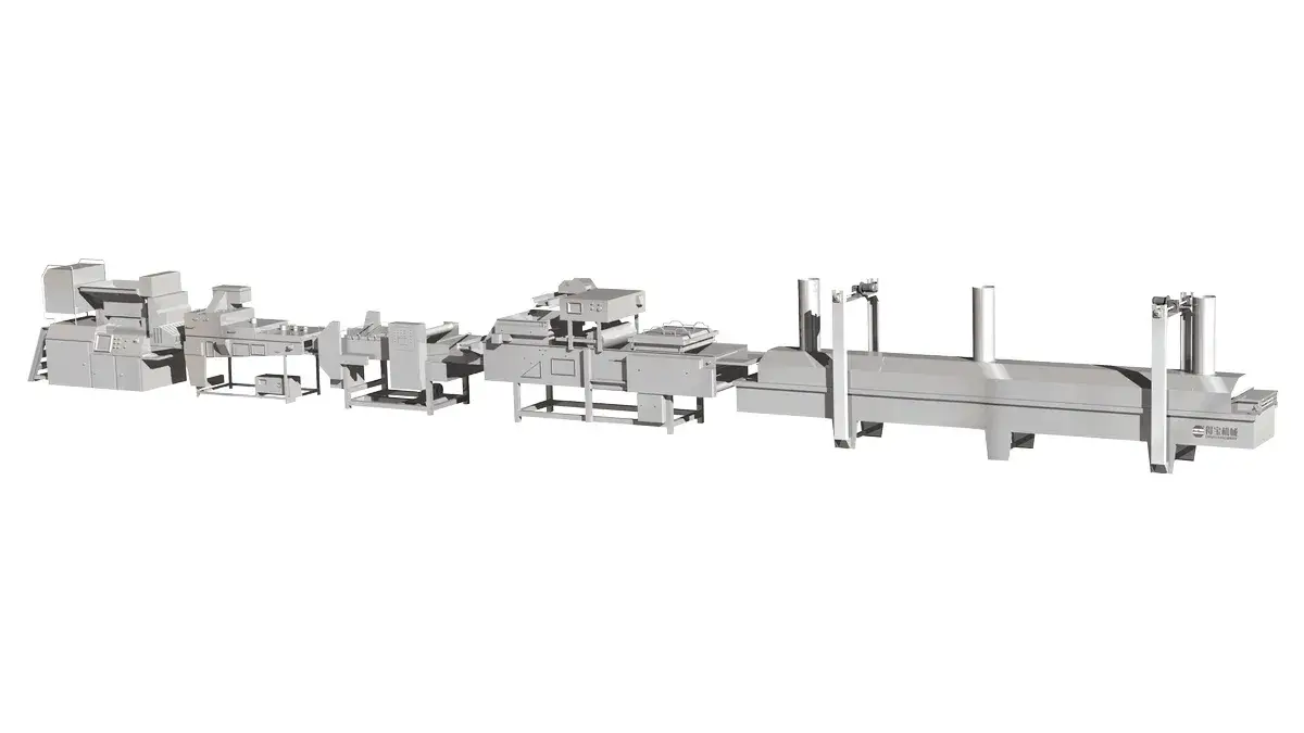 The breaded and battered food production lines are specifically designed for the industrial mass production of meat and battered food items. The processing line consists of a forming machine, flour coating machine, battering machine, breading machine, and fryer to complete the automated production of coated products, ensuring high efficiency and consistent product quality through advanced automation.