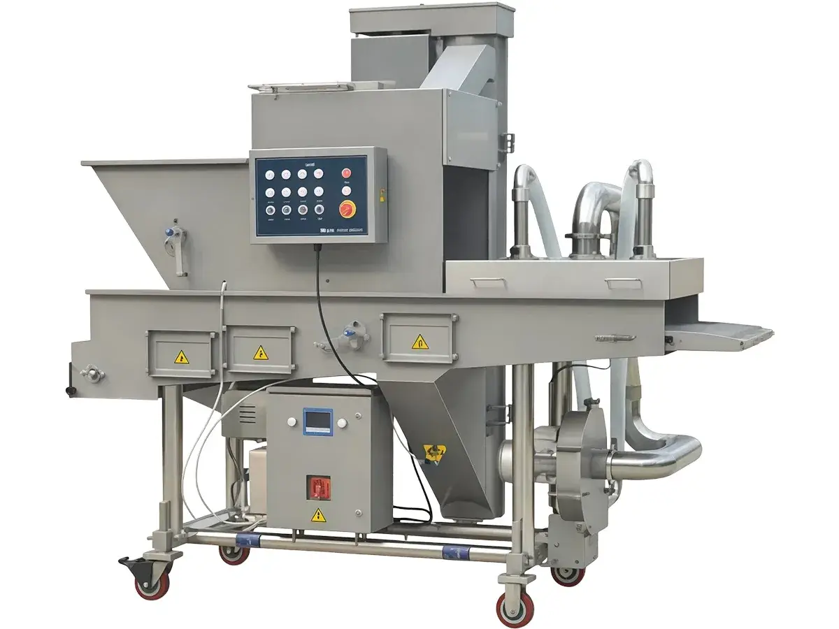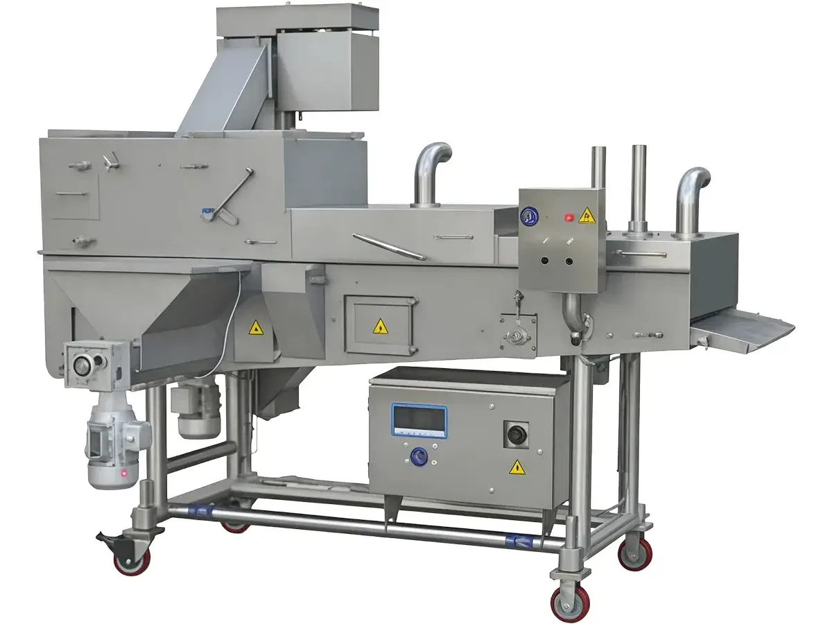 Battering MachineThe battering machine ensures that chicken, beef, pork, fish, shrimp, and other products are completely submerged and covered. As the products move along the conveyor, they pass through a falling curtain of batter that coats the top and sides, while simultaneously moving through a submerged bath of batter at the bottom to ensure the underside is fully coated.