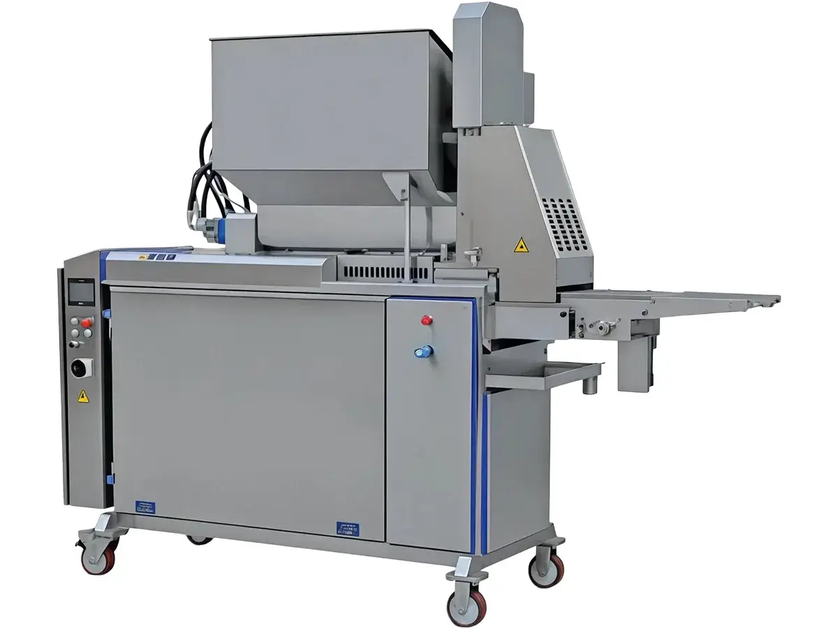 Forming MachineThe forming machine automatically completes the filling, forming, and output of meat. It can be integrated with the battering machine, flour coating machine, fryer, steamer, freezer, and packaging machine to form a complete automatic production line for cooked foods. It is suitable for forming meat, poultry, fish, shrimp, potatoes, or vegetables. It is suitable not only for minced materials but also for various chunk-based products, producing burger patties, chicken nuggets, chicken tenders, and fish fillets.