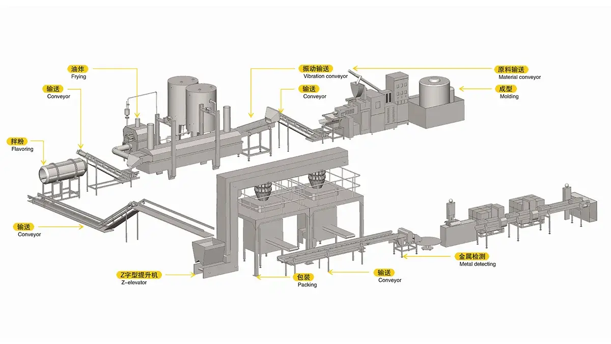 The puffed snack production line is specifically designed for the industrial mass production of extruded puffed snacks. The complete line consists of a raw material mixing system, extrusion puffing system, fryer, frying oil treatment system, de-oiling system, seasoning system, cooling system, distribution system, packaging system, and control system. The production line achieves fully automated production of puffed snack foods, ensuring high efficiency and consistent product quality through advanced automation.
